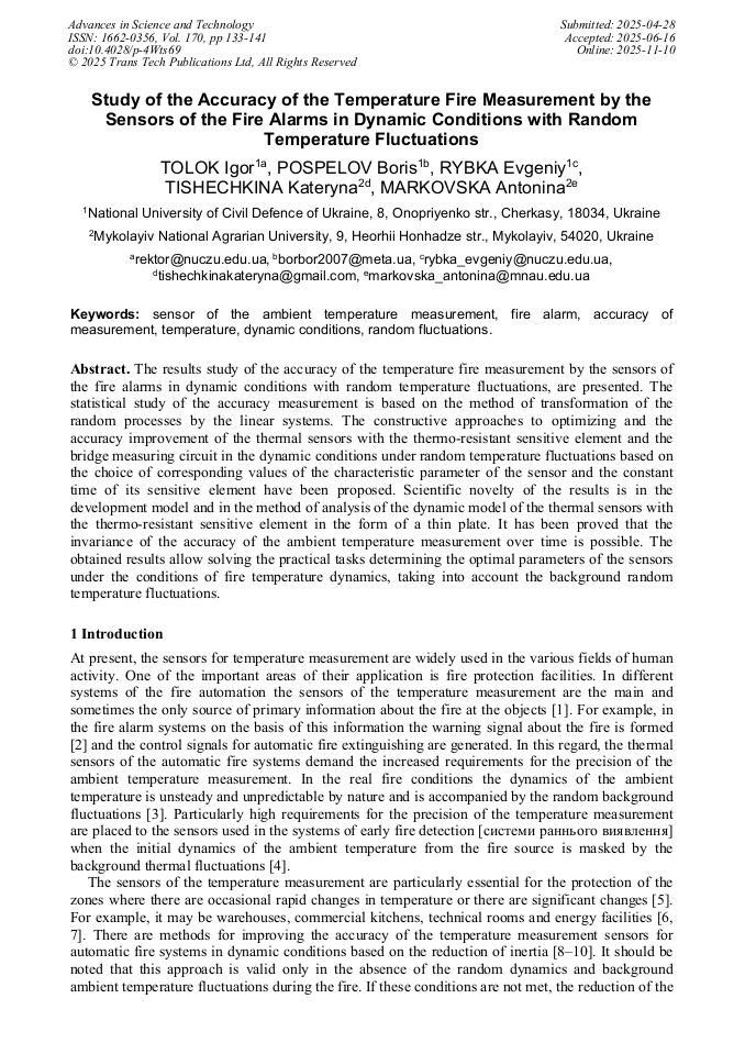 | Короткий огляд (реферат): | The results study of the accuracy of the temperature fire measurement by the sensors of the fire alarms in dynamic conditions with random temperature fluctuations, are presented. The statistical study of the accuracy measurement is based on the method of transformation of the random processes by the linear systems. The constructive approaches to optimizing and the accuracy improvement of the thermal sensors with the thermo-resistant sensitive element and the bridge measuring circuit in the dynamic conditions under random temperature fluctuations based on the choice of corresponding values of the characteristic parameter of the sensor and the constant time of its sensitive element have been proposed. Scientific novelty of the results is in the development model and in the method of analysis of the dynamic model of the thermal sensors with the thermo-resistant sensitive element in the form of a thin plate. It has been proved that the invariance of the accuracy of the ambient temperature measurement over time is possible. The obtained results allow solving the practical tasks determining the optimal parameters of the sensors under the conditions of fire temperature dynamics, taking into account the background random temperature fluctuations. |